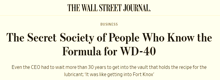 The formula for the lubricant was jotted down in a spiral notebook 70 years ago, along with the 39 previous attempts to get it right, and is now kept in a lockbox at an undisclosed Bank of America location, I read in The Knowledge yesterday.